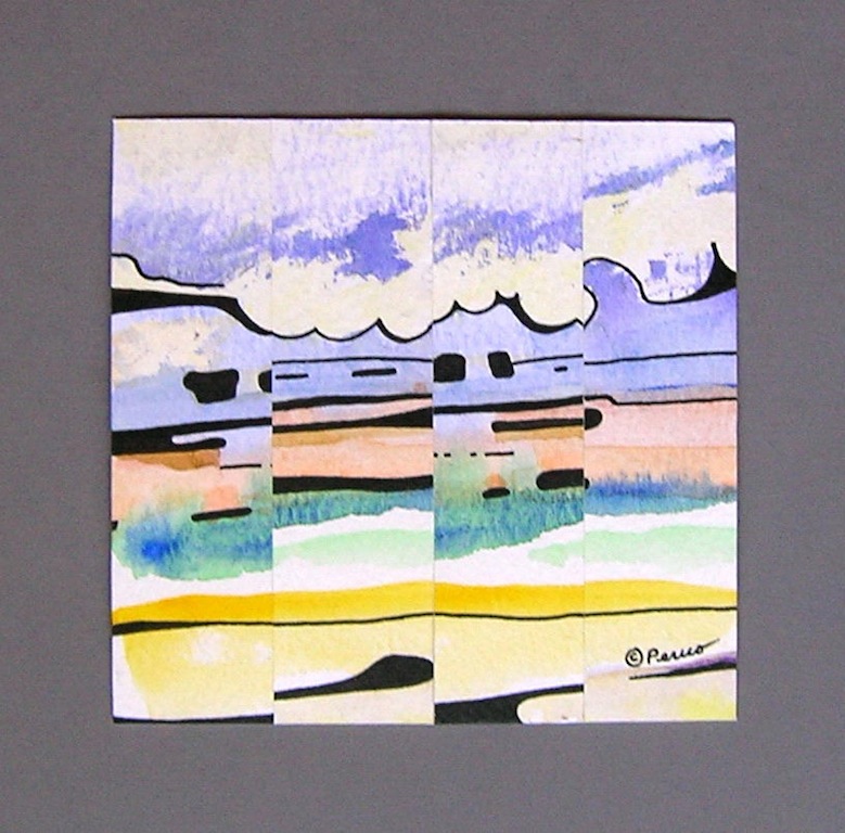 Land and Sky 2 – watercolor and ink on paper, panel assemblage, 3-7/8 x 4″