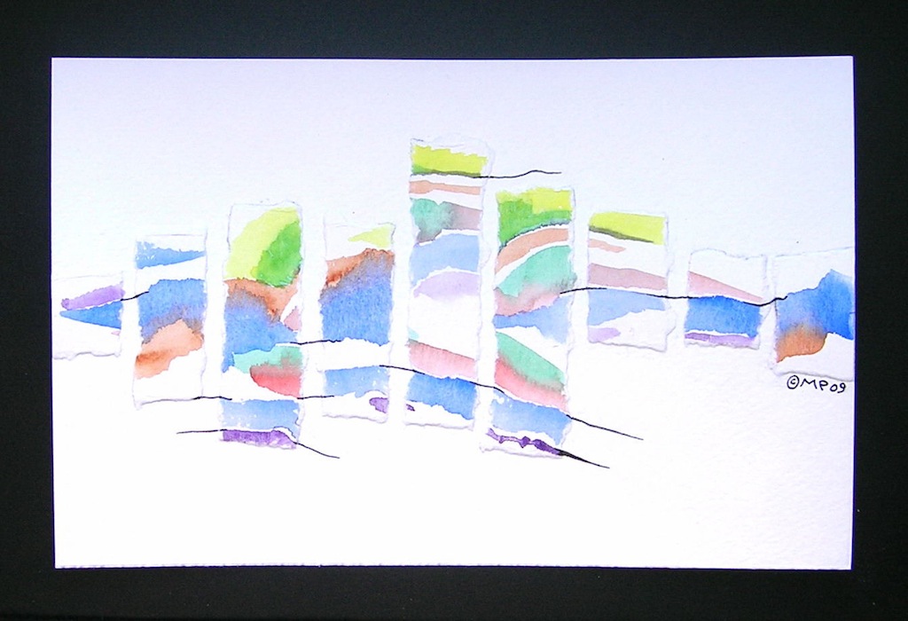 Fragmented Land and Sky – watercolor and ink on paper, panel collage, 5-1/2 x 8-1/2″