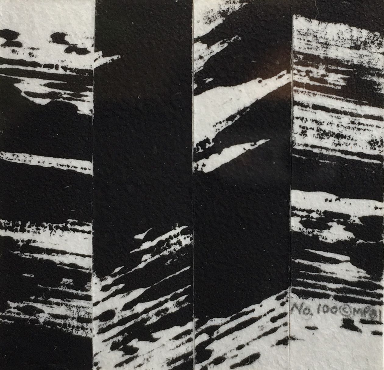 Midnight Storm – ink monoprint on paper, panel assemblage, 1-3/8 x 1-3/8″