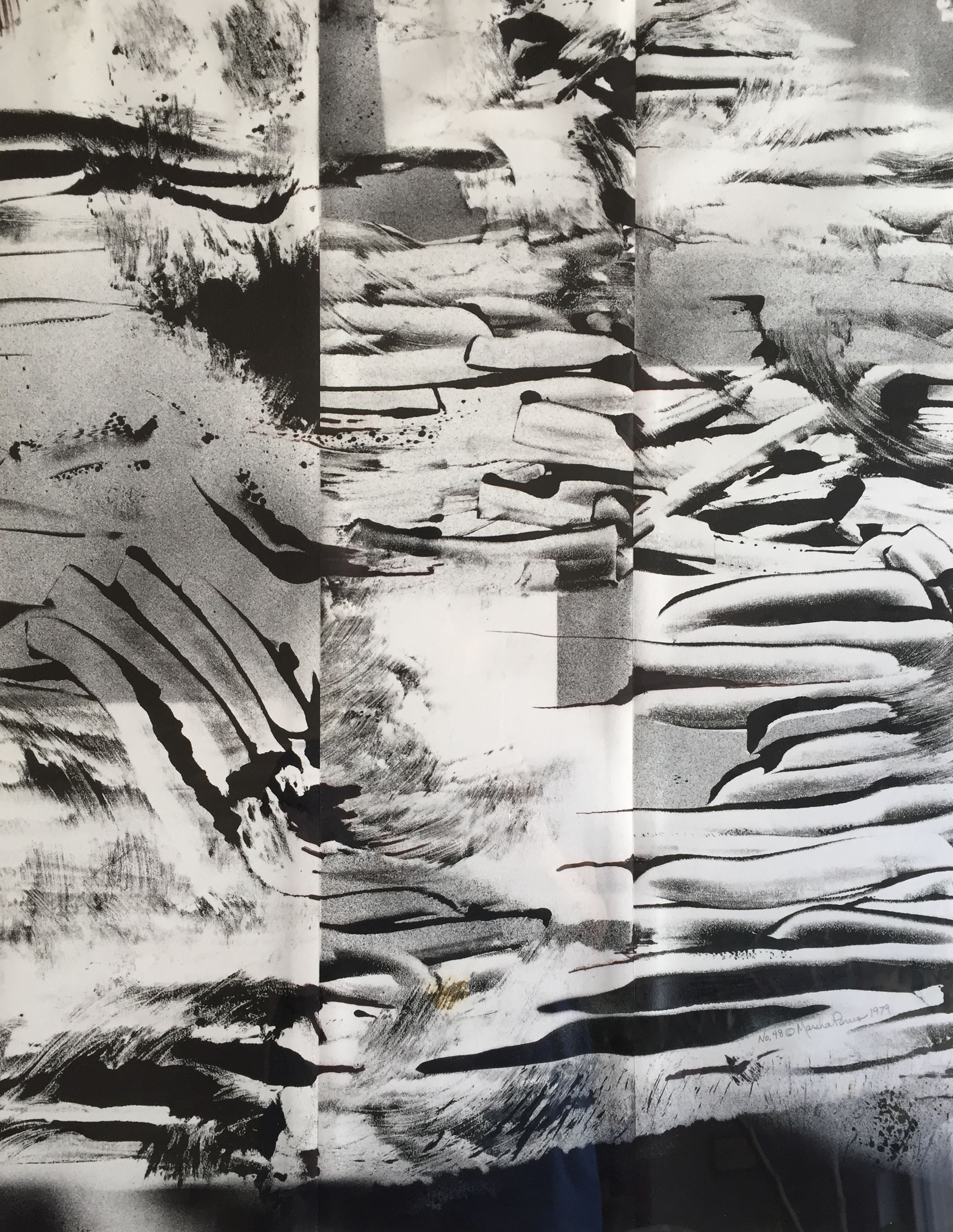 Cascade – ink monoprint and spray paint on paper, panel assemblage, 17-5/8 x 22-3/4″